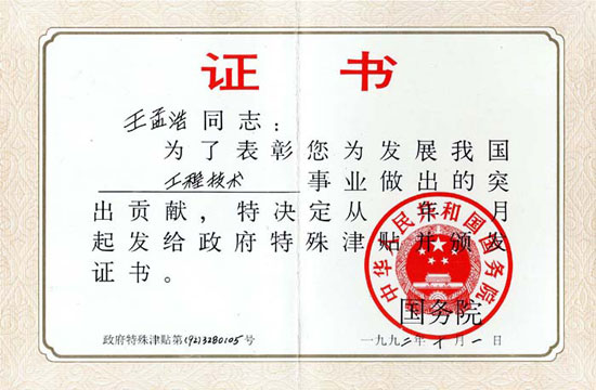 中華人民共和國(guó)國(guó)務(wù)院政府特殊津貼證書(shū)